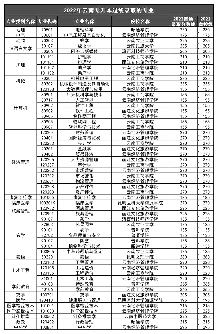2022年云南专升本,公办院校过线就录取的专业一共有14个,主要分布在农学和汉语言文学这两大类,其中农学类占比最多,共有7个专业过了省控线就录取,主要分布在云南农业大学和普洱学院。