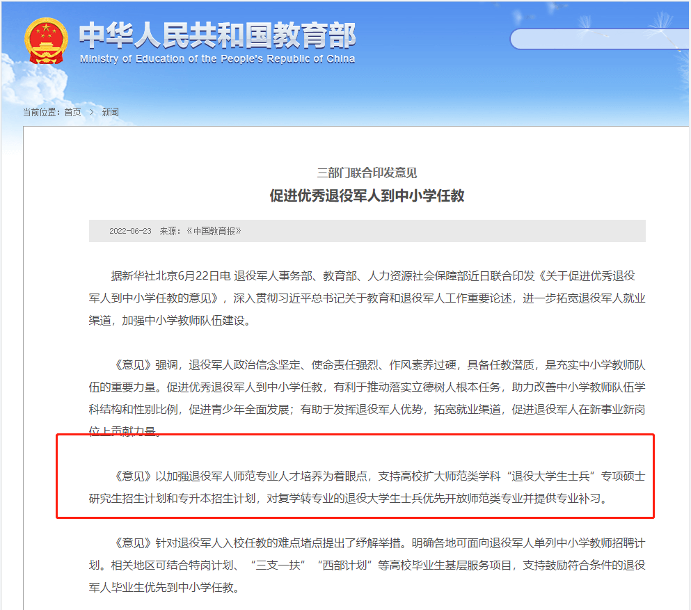 根据三部门联合印发意见促进优秀退役军人到中小学任教中,可以看到加强退役军人师范专业人才培养为着眼点,支持高校扩大师范类学科“退役大学生士兵”专项硕士研究生招生计划和专升本招生计划,对复学转专业的退役大学生士兵优先开放师范类专业并提供专业补习。