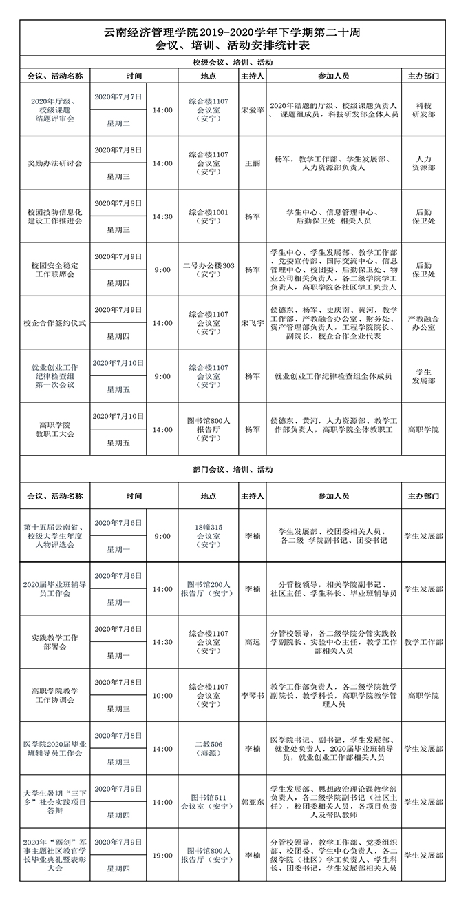 云南经济管理学院2019-2020学年下学期第二十周会议、培训、活动安排统计表