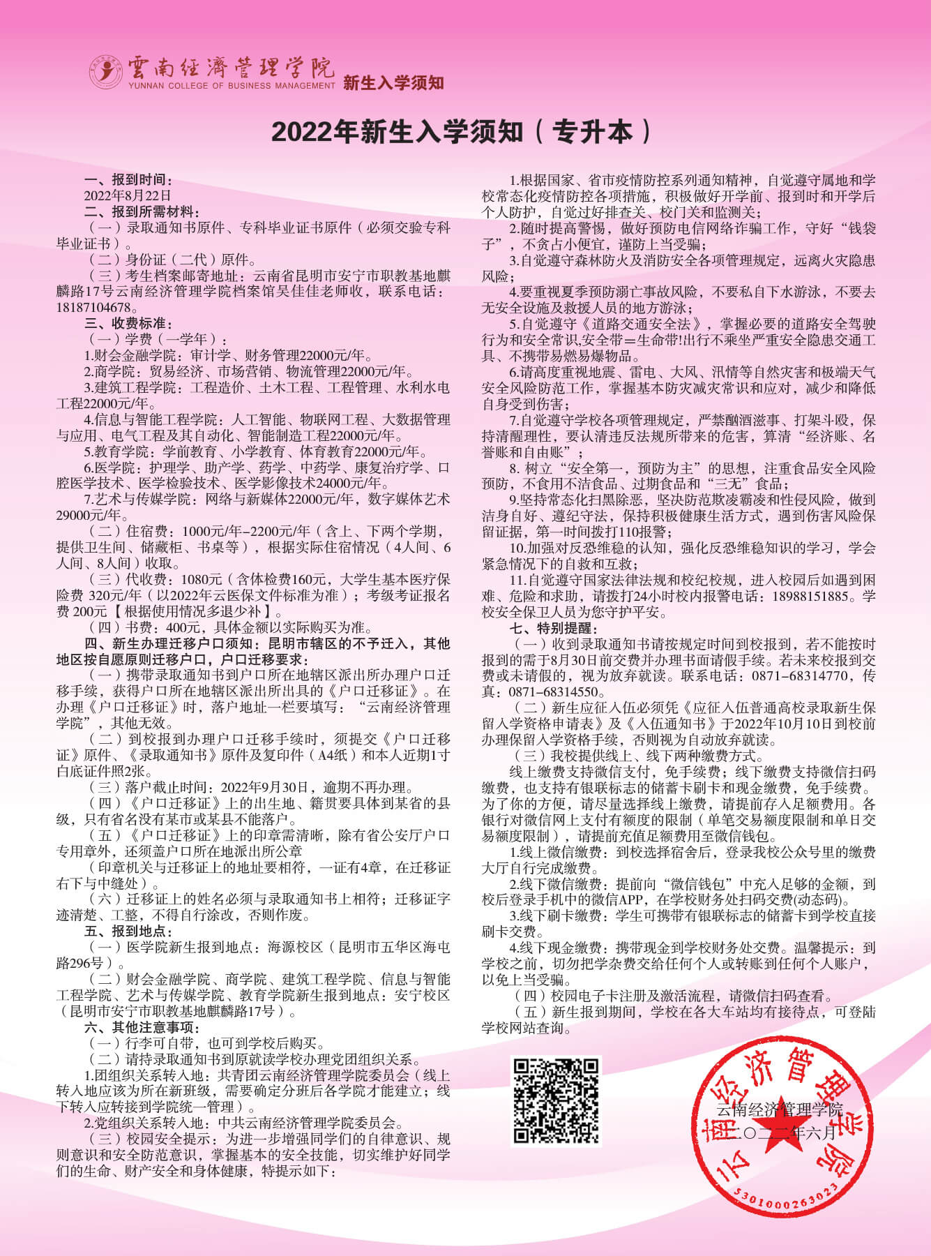 2022年云南经济管理学院专升本新生入学须知