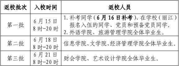 毕业生返校前确保身体状况良好,向辅导员申报返校,提供到达丽江航班或车次准确信息。所有返校毕业生必须遵守属地、返程途中、学校一切疫情防控管理规定和要求。