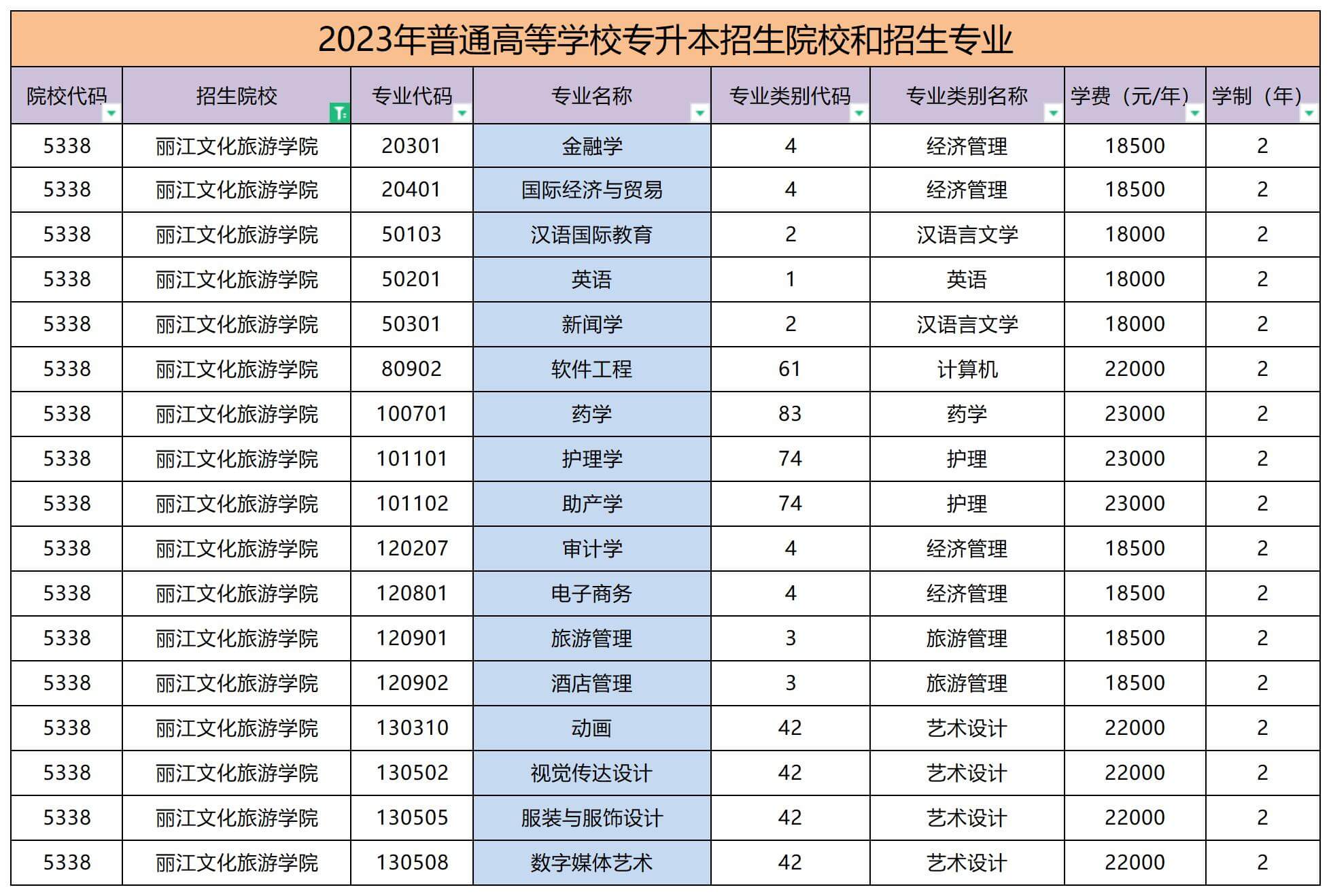 2023年丽江文华旅游学院专升本招生专业有金融学、国际经济与贸易、汉语国际教育、英语、新闻学、软件工程、药学、护理学、助产学、审计学、电子商务、旅游管理、酒店管理、动画、视觉传达设计、服装与服饰设计、数字媒体艺术。