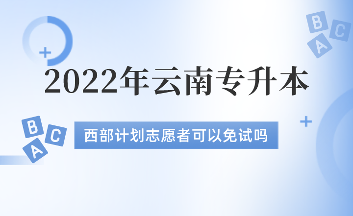 2022年云南专升本西部计划志愿者不能免试。具有云南户籍及普通高职(专科)院校全日制毕业学历参加“大学生志愿服务西部计划”,参加西部计划项目前无工作经历、服务期满且考核合格后2年内的志愿者可以报名云南普通专升本,考试科目、流程和应届普通毕业生是一样的。