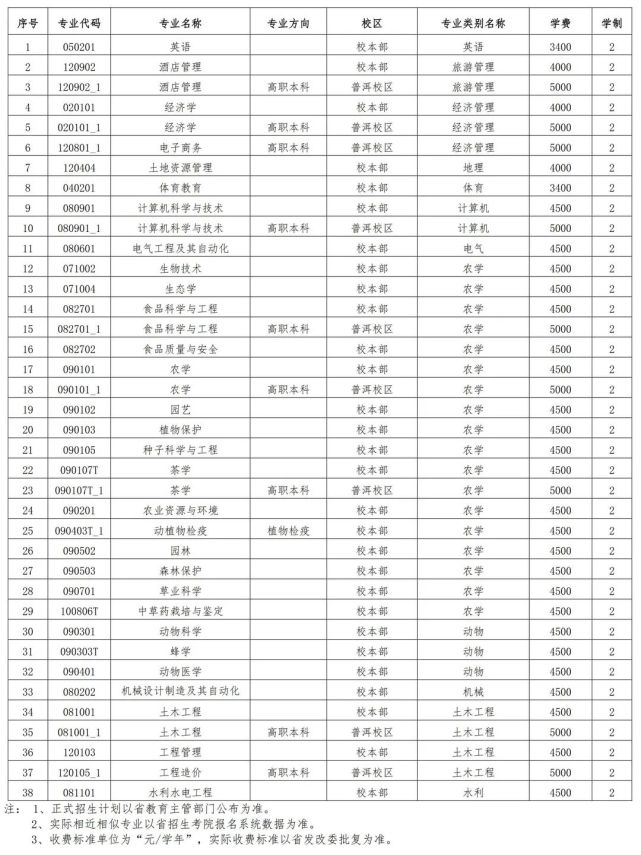 学校专升本招生专业有“普通本科”和“高等职业教育普通本科”(以下简称“高职本科”)2个类别,同属于本科层次,均为全日制培养模式。2021年我校专升本计划招生专业共有38个,涉及12个专业类别(其中农学类18个专业、英语类1个专业、旅游管理类2个专业、电气类1个专业、动物类3个专业、机械类1个专业、计算机类2个专业、经济管理类3个专业、体育类1个专业、土木工程类4个专业、地理类1个专业、水利类1个专业)。