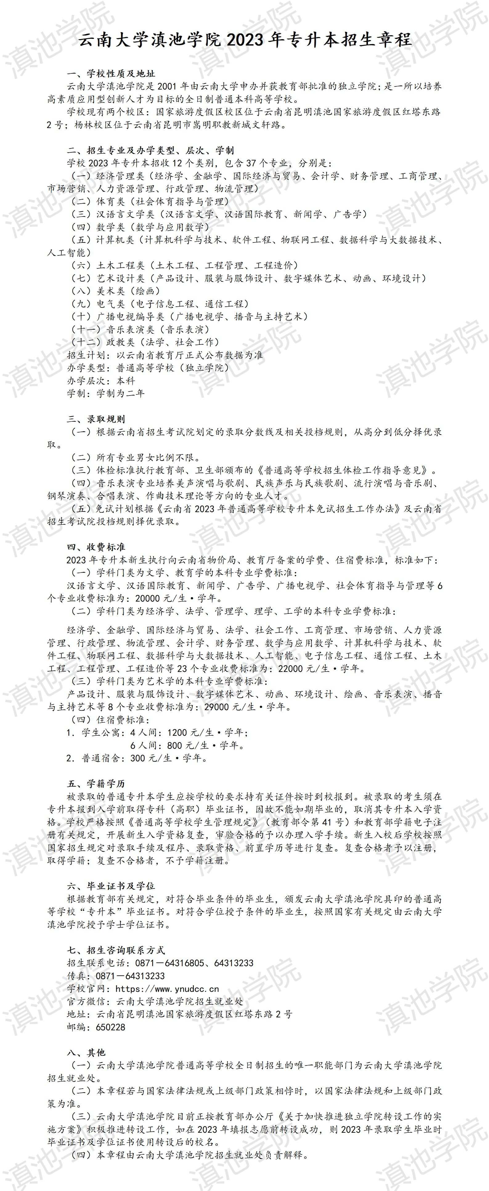 2023年云南大学滇池学院专升本招生章程