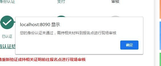 给出成功提示后关闭提示,返回首页继续进行报名操作。如身份认证不通过,需到报名点进行现场审核。