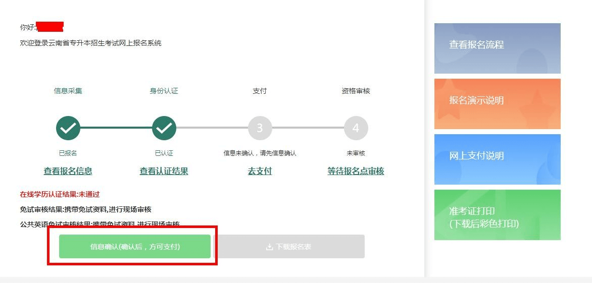 注册登录系统后,进入状态页面,如图3。考生需进行信息采集、身份认证、网上支付、信息确认、等待资格审核等操作。