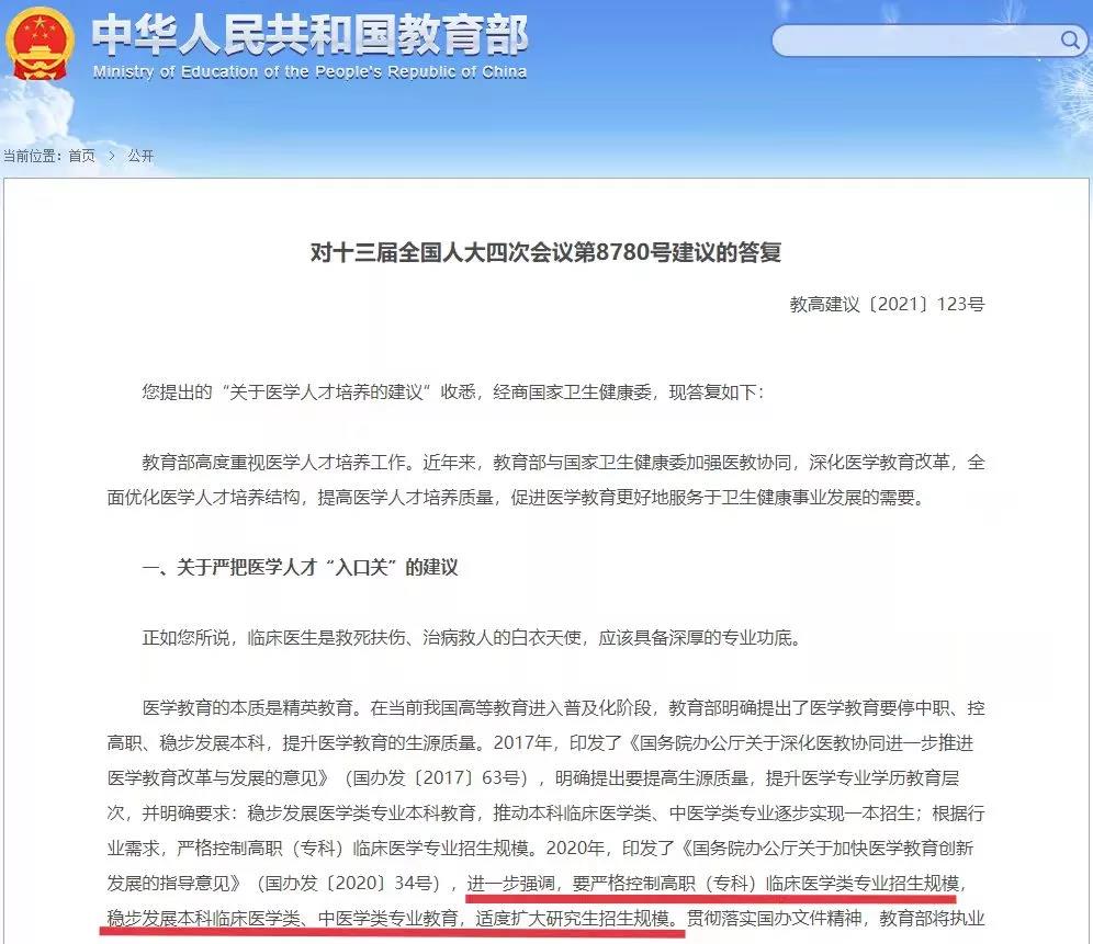 比如说临床医学专业,随着国家政策中明确提出“严格控制高职(专科)临床医学类专业招生规模,稳步发展本科临床医学类、中医学类专业教育,适度扩大研究生招生规模。”